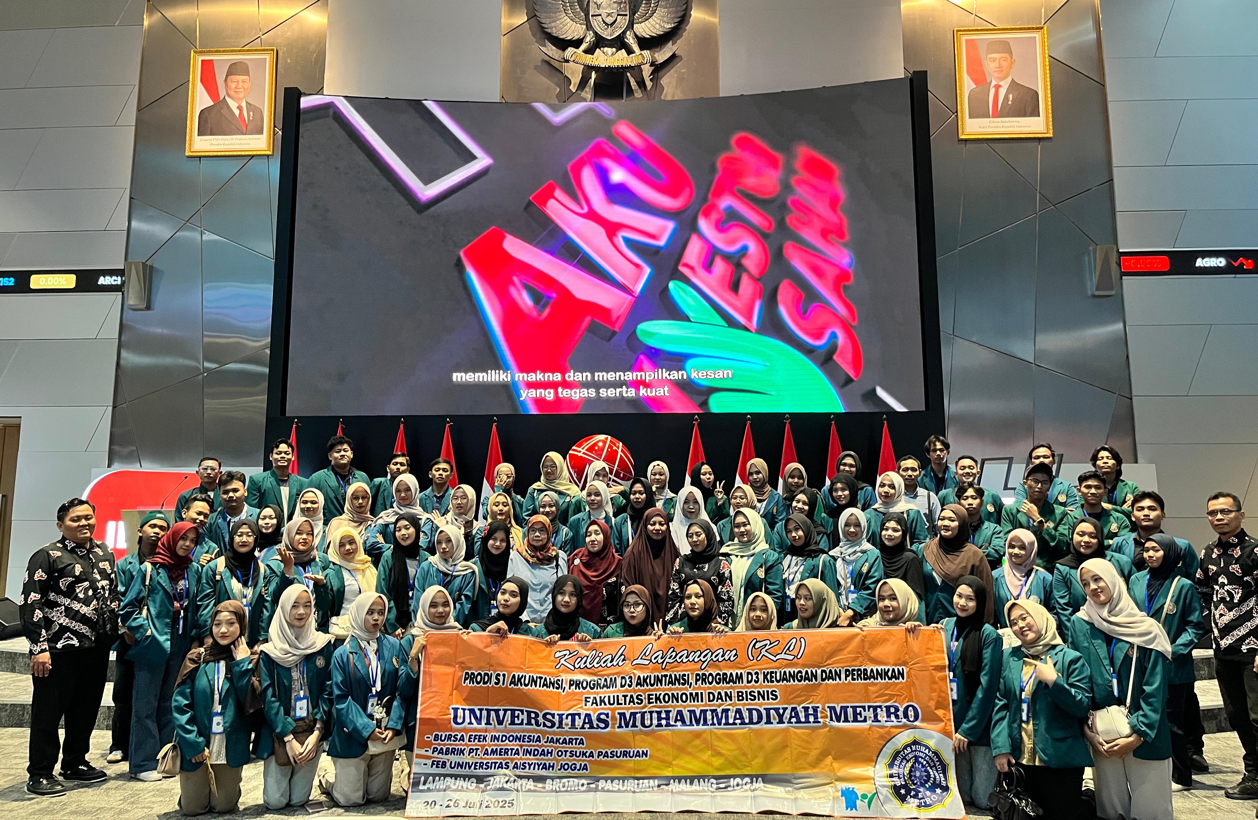 Metro – Fakultas Ekonomi dan Bisnis (FEB) Universitas Muhammadiyah Metro melaksanakan kegiatan Kuliah Lapangan (KL) dengan mengunjungi Bursa Efek Indonesia (BEI). Kegiatan ini diikuti oleh mahasiswa dari Prodi S1 Akuntansi, Prodi D3 Akuntansi, serta Prodi D3 Keuangan dan Perbankan.