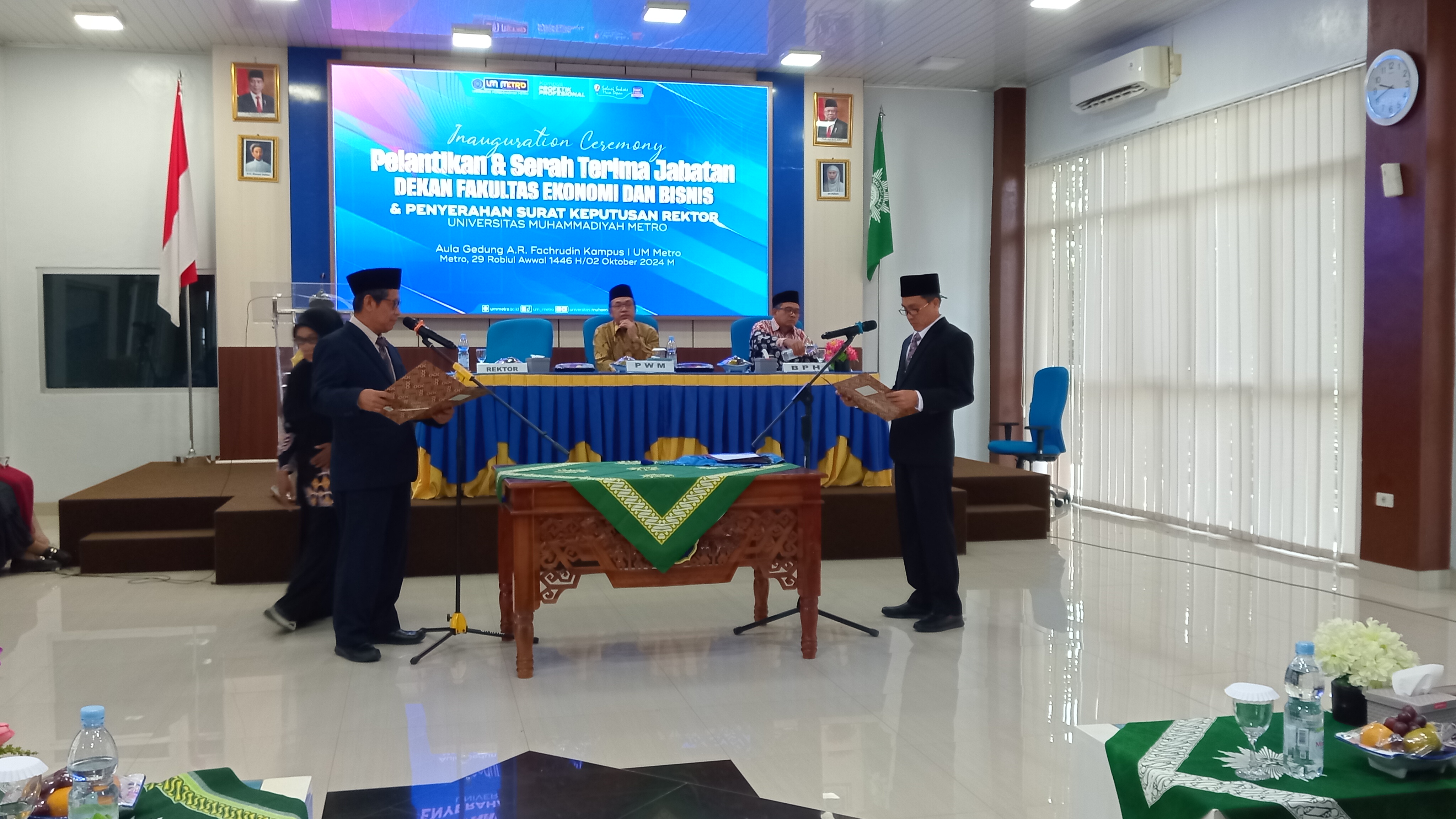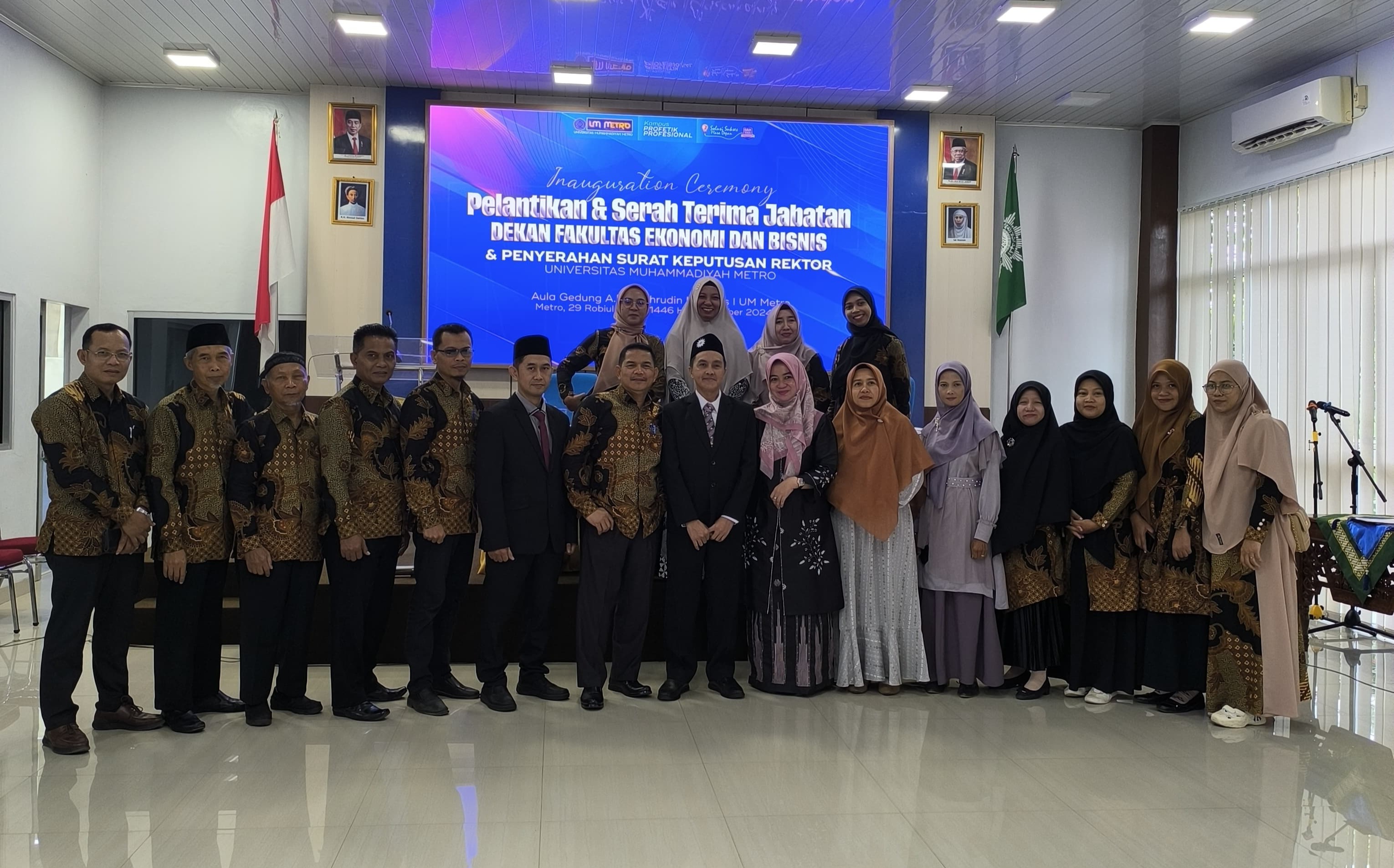 Fakultas Ekonomi dan Bisnis (FEB) Universitas Muhammadiyah Metro menggelar acara Inauguration Ceremony Pelantikan dan Serah Terima Jabatan Dekan Fakultas Ekonomi dan Bisnis yang berlangsung di Aula AR. Fachruddin pada 2 Oktober 2024. Acara ini juga dirangkaikan dengan penyerahan Surat Keputusan Rektor kepada pejabat baru di lingkungan fakultas.